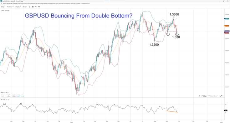 The GBPUSD has been stuck in a sideways trend throughout the summer as investors assessed the outlook for the Fed and the BOE. With greater clarity on the data, the pair could finally break in a new direction. It's just bouncing off support at 1.3300 for the second time, which could form a double bottom, allowing it to head back to the middle Bollinger Band at 1.3520. If it breaks through resistance, it could head toward the September high of 1.3360. On the other hand, if it proves to be a false double bottom, then the pair could move towards support at the August low of 1.3200.