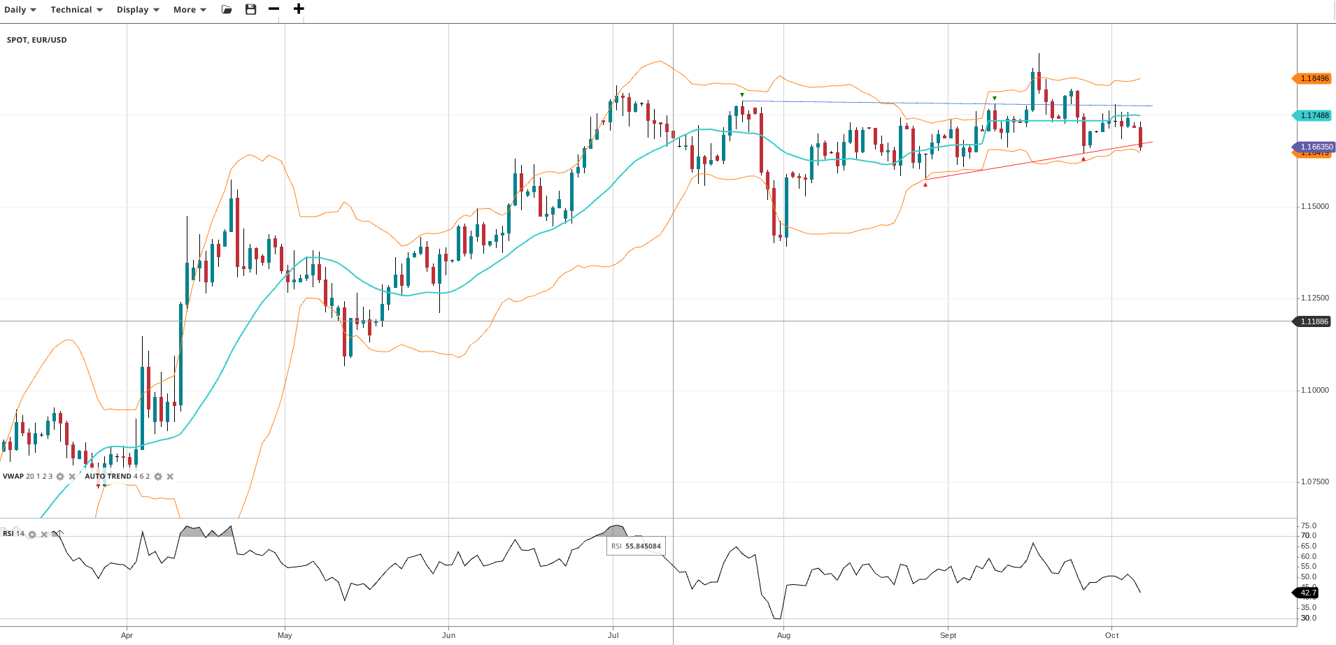 EUR/USD remains range-bound in a neutral trend, trading at 1.1664, just below its VWAP of 1.1749. RSI at 42.7 suggests weakening momentum. Support is at 1.1664 with resistance at 1.1850.