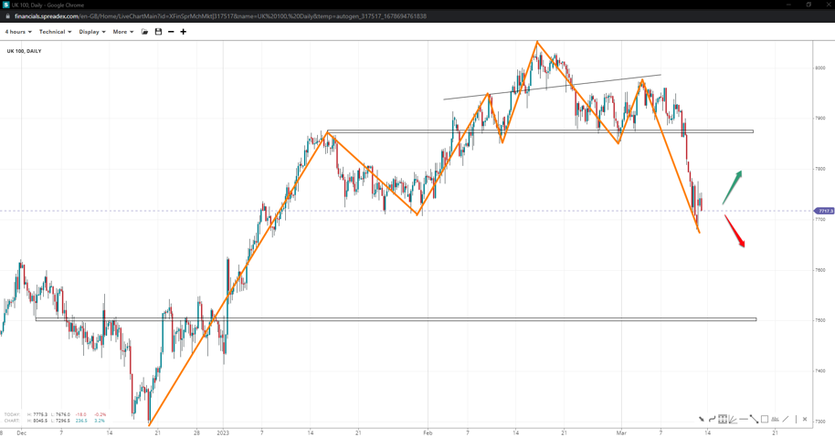 The head-and-shoulders has started to weigh on prices following the break of the 7880 swing, with the bearish continuation to 7670 offering an opportunity for a bounce. Holding the base might offer some respite towards 7850 and form a larger H&S unless it fails and kicks the door to 7500 open.