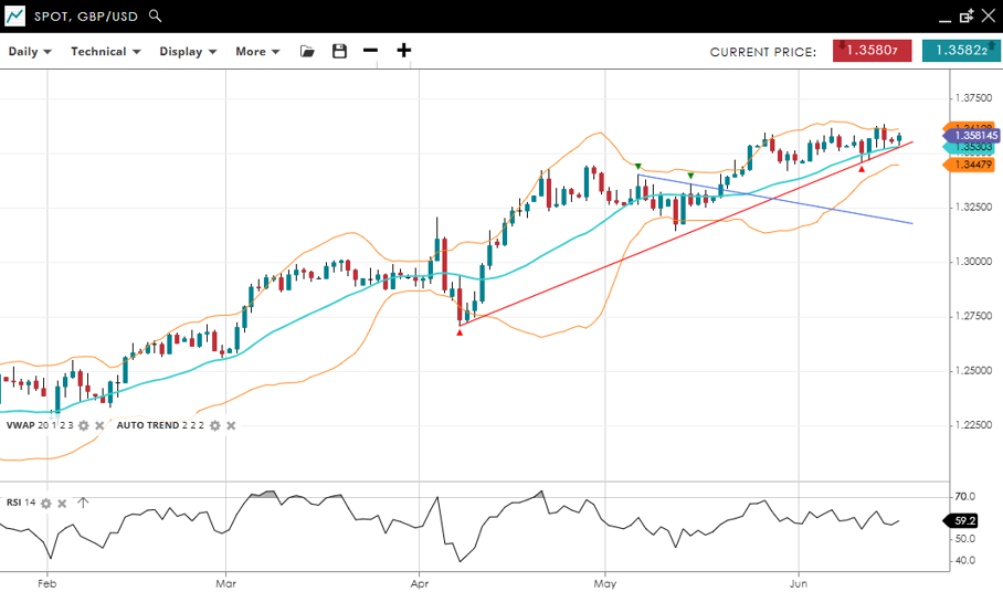 GBP/USD continues its bullish trend in an impulsive phase. Price is at 1.3581, just above the VWAP of 1.3530. RSI at 59.2 indicates stable bullish momentum. Support is at 1.3448, with resistance at 1.3610.
