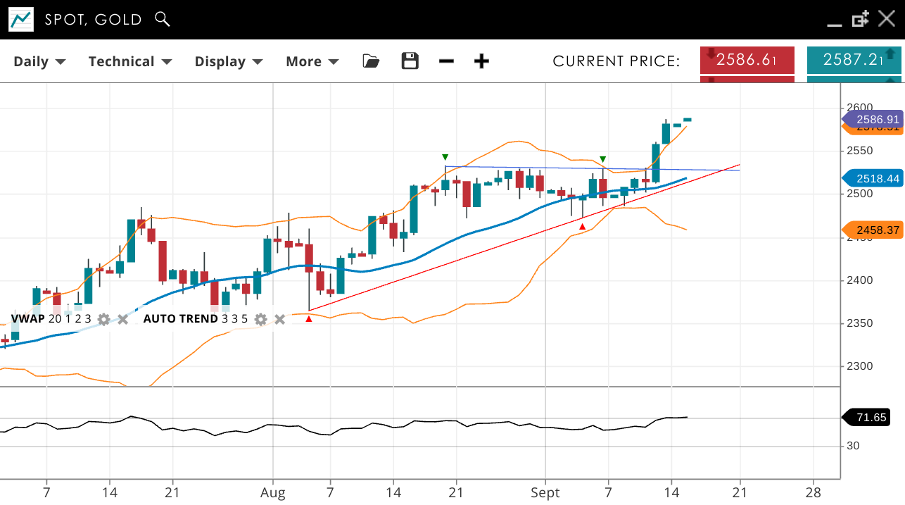 Gold remains bullish, currently in a corrective phase. The price is 2,586, slightly above the VWAP of 2,518. Support is at 2,458, with resistance at 2,576. The RSI is at 71, showing strong bullish momentum.