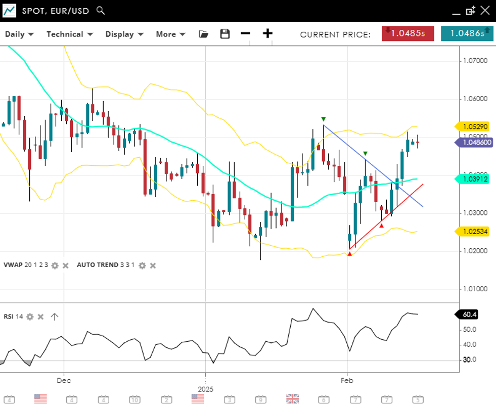EUR/USD has entered a neutral stance, trading at 1.0331 in the middle of a 1.02 to 1.05 range, slightly below its VWAP (20) of 1.0378. The pair is consolidating with support at 1.0247 and resistance at 1.0509. RSI at 45 indicates a lack of clear directional momentum for now.