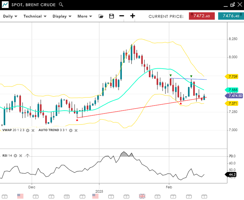 Brent Crude has entered a new volatile consolidation, trading at 7,448, back below its VWAP (20) of 7,692 and under the key 75 level. Support is forming at 7,330, while resistance is overhead at 8,053. The RSI at 38 signals neutral momentum, with potential for either a breakout or further consolidation.