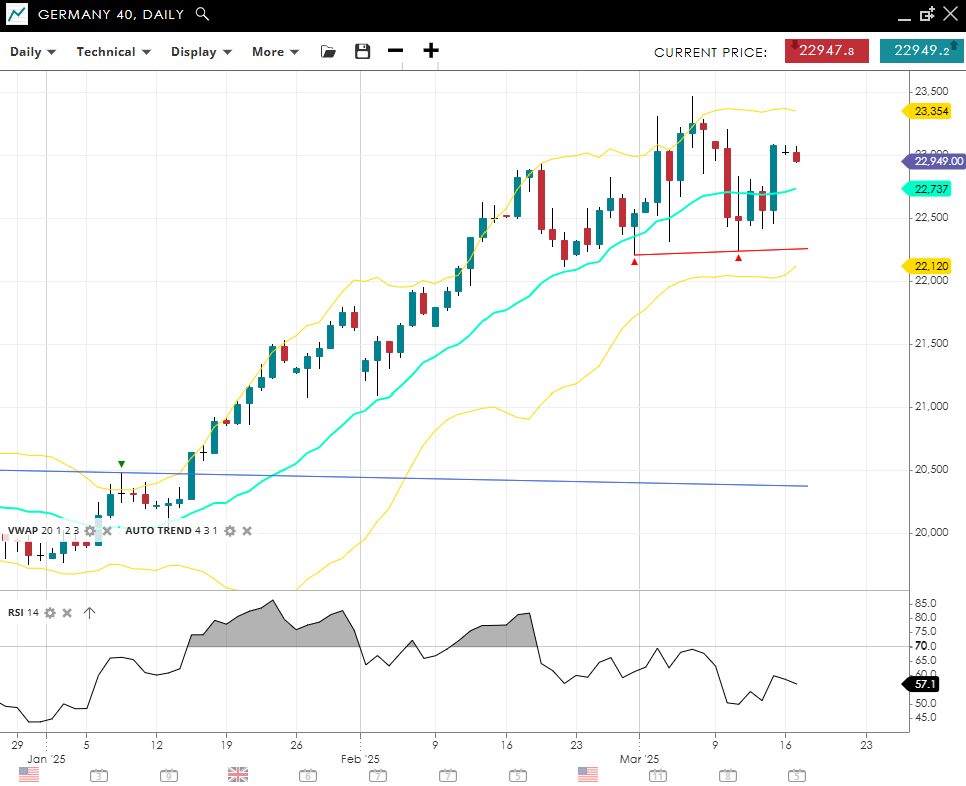 Germany 40 maintains a bullish trajectory, with price action at 22 949 firmly above its 20‐day VWAP of 22 737—indicating an impulsive upswing. The RSI at 57 points to moderate upward momentum, while support at 22 120 could cushion any pullbacks. Resistance is located at 23 354, where a decisive break may open further upside.