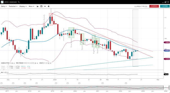 EUR/USD is in the corrective phase of a bearish trend, with the price waking just above its 20-period VWAP of 1.0787. The support is at 1.0706, with resistance at 1.0864. The RSI at 46 indicates a bearish bias, suggesting potential for further declines.
