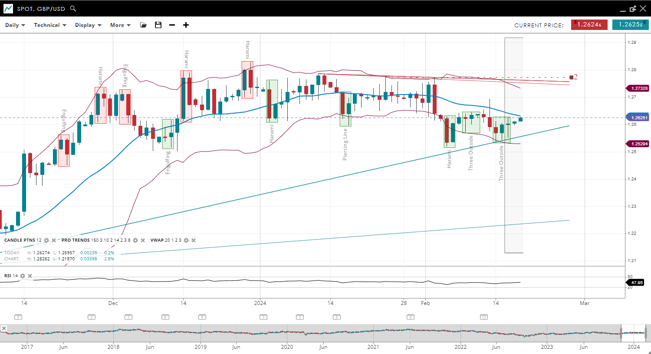 GBP/USD is consolidating in what has been a weak bearish trend, with the price below the flat-to-down-sloping 20-period VWAP of 1.2626. Support is found at 1.2529, with resistance at 1.2732. The RSI at 47 suggests a bearish outlook, with room for downward movement.