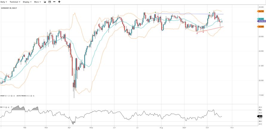 Germany 40 has re-entered its trading range after a failed bullish breakout. Price trades at 24,057, slightly below its VWAP of 24,206. RSI at 48.4 suggests subdued momentum. Support lies at 23,683, while resistance is 24,729.