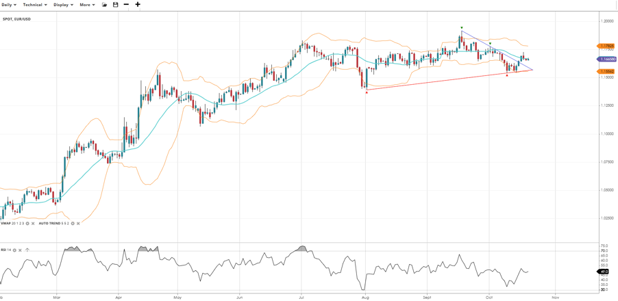 EUR/USD holds its trading range, now trading at 1.1666, right next to its VWAP. RSI at 49.0 signals neutral momentum. Support is at 1.1556, and resistance is at 1.1782.