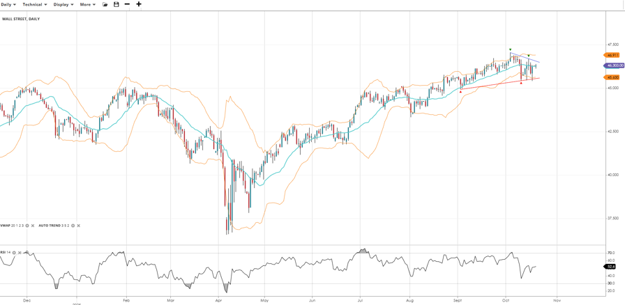 Wall Street remains in a bullish trend but continues to correct lower, currently at 46,303, on top of its VWAP. RSI at 52.6 shows a neutral stance. Support lies at 45,630, and resistance is estimated at 46,911.