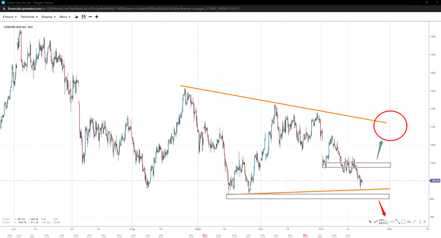 London gas prices seem to be finishing the completion of the 4th leg of a symmetrical triangle unless it slides to $910 for a descending variation or forms a pennant instead. If prices rise, the likelihood of moving closer to $1100 will increase, with the trendline being a potential rejection level and $1000 an interim resistance.
