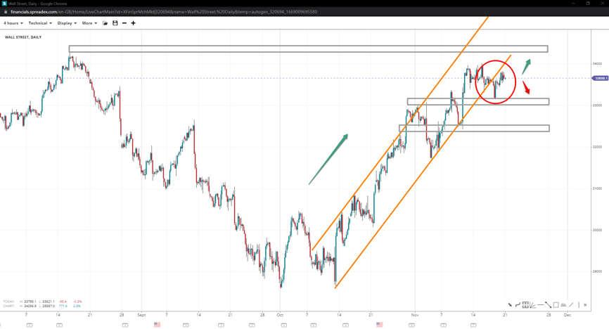 Wall Street failed to breach the 34k handle but remains in an upward trend, albeit not in the short term, as prices have exited the ascending channel. However, the pullback to 33150 offered a bounce to 33830, which brings the chances of consolidation up unless bulls attempt 34280.  33k remains a critical short-term support, the break of which exposes 32500.