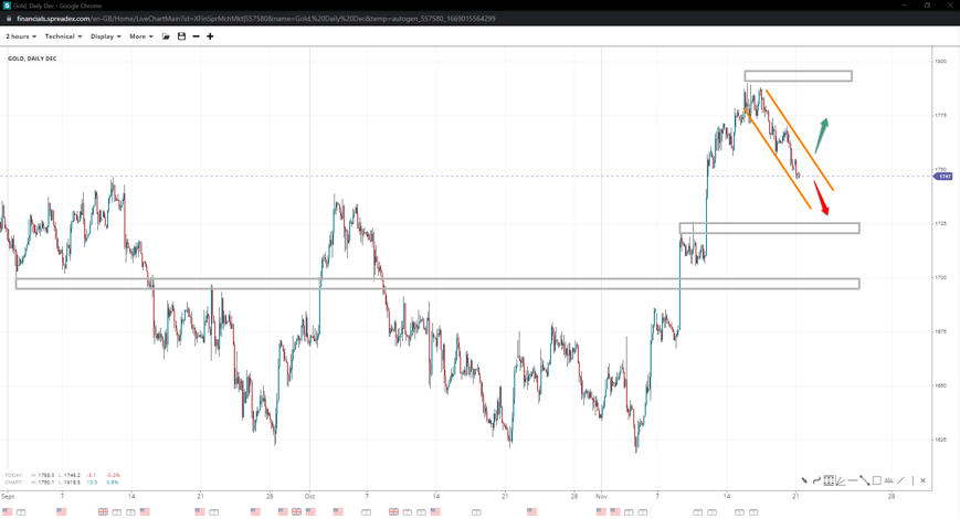 Gold prices have dropped from the top of $1790 down to $1750 as a likely part of a rising flag correction. $1700 is major support, with 1725 as a spot for a short-term rejection. If the low holds firm, bulls might step back in and send prices toward the top for a range.