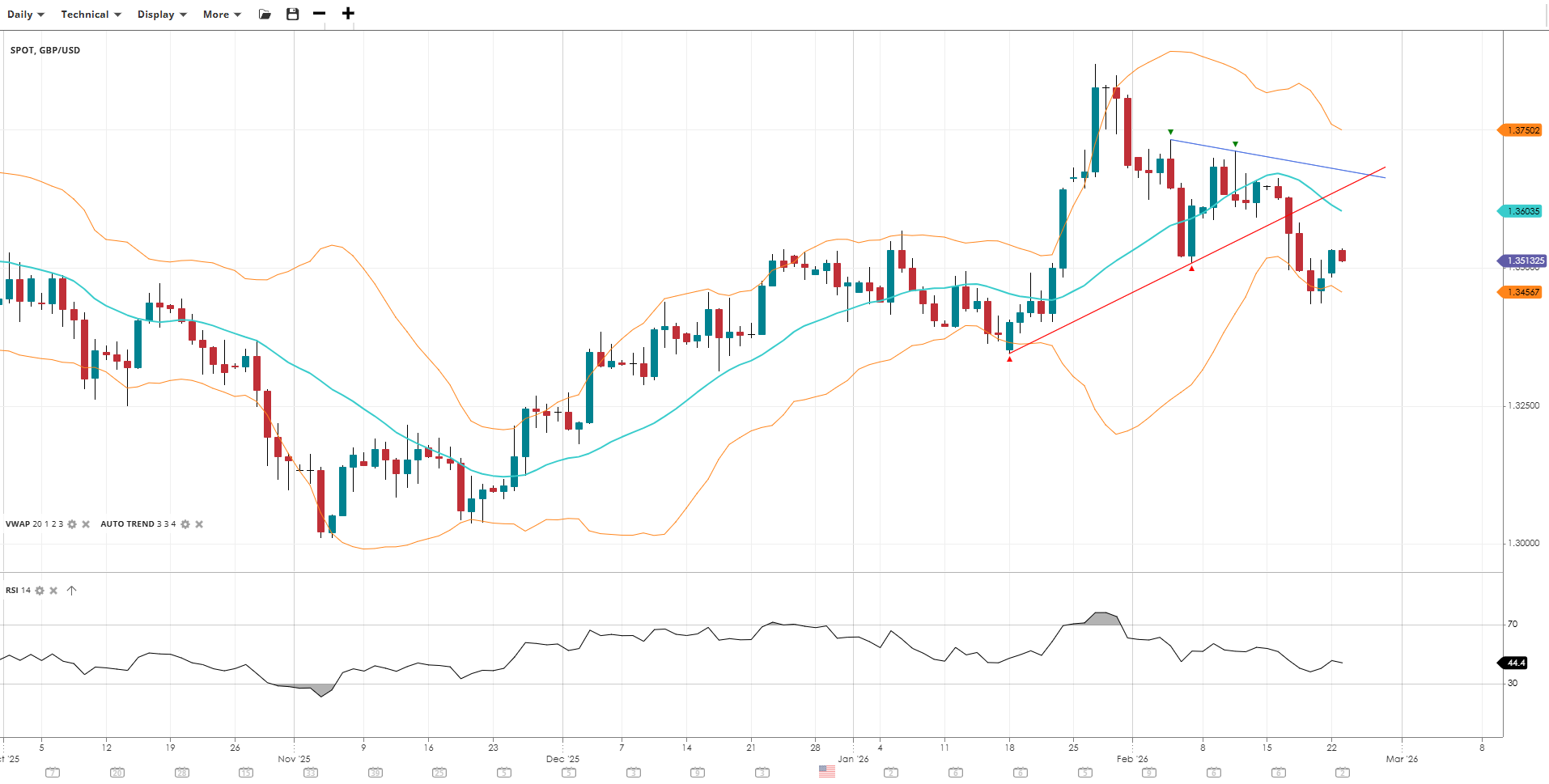 GBP/USD has extended into a more prolonged correction, still trading below the 20-day VWAP (1.3604) at 1.3513. The RSI has dropped to 44, signalling that bearish momentum is building. The key support level to watch is 1.3457, which bulls must defend to prevent further downside. A reclaim of the VWAP would be the first signal that the pullback is coming to an end.