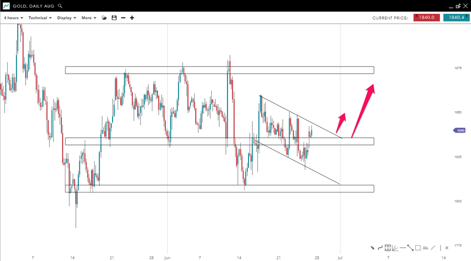 Gold has re-entered the inside of the parallel channel made of the following key levels, 1,835 & 1,875. The price is currently bouncing inside a bullish flag formation. If the price stays above the 1,835 mark, this could lead to a breakout of the pattern and a move to the upside toward the 1,875 mark.