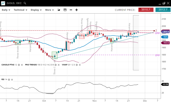 The chart shows Gold consolidating with a slightly bullish bias, as indicated by the VWAP. The RSI at 63.9 is neutral, suggesting no immediate overbought or oversold conditions. Support and resistance levels are at 1933 and 2011.
