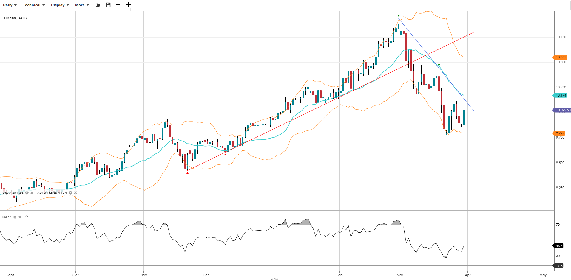 | UK 100 | Bearish | Impulsive | 10,026 | 10,174 | 9,797 | 10,551 | 44 |