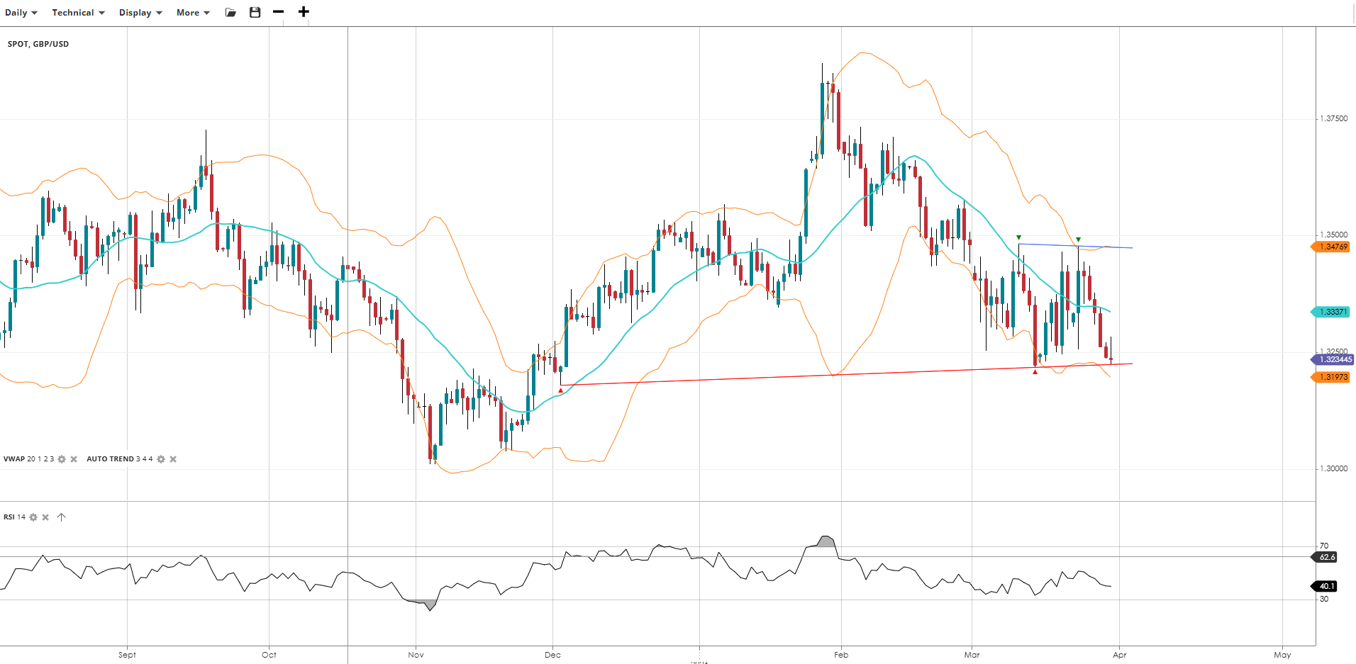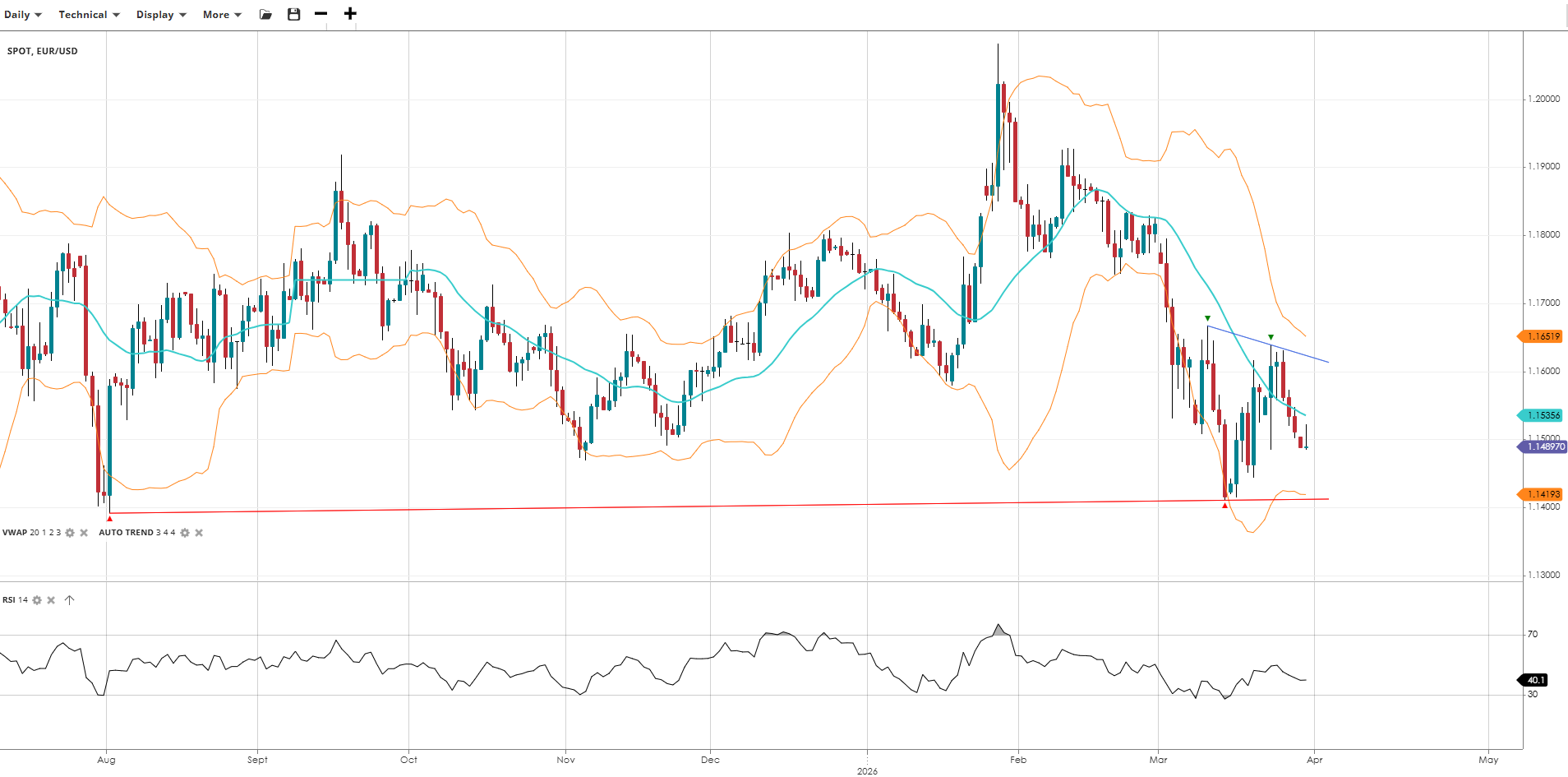 GBP/USD has been trading in a 200-pip range for most of March, now trading below a flat VWAP. The RSI has softened to 40 after touching 50, reflecting the modest but steady bearish pressure. The long-term range remains intact, and the pair will need to take out the high or lows of the range to start a new trend.