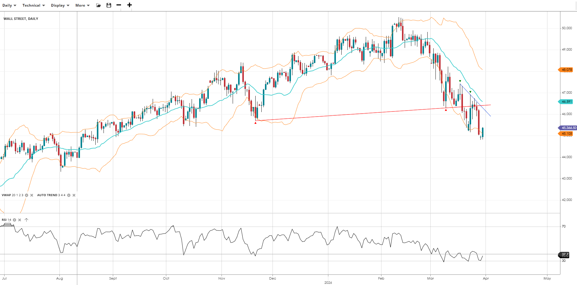 | Wall Street | Bearish | Impulsive | 45,367 | 46,591 | 45,105 | 48,078 | 38 |