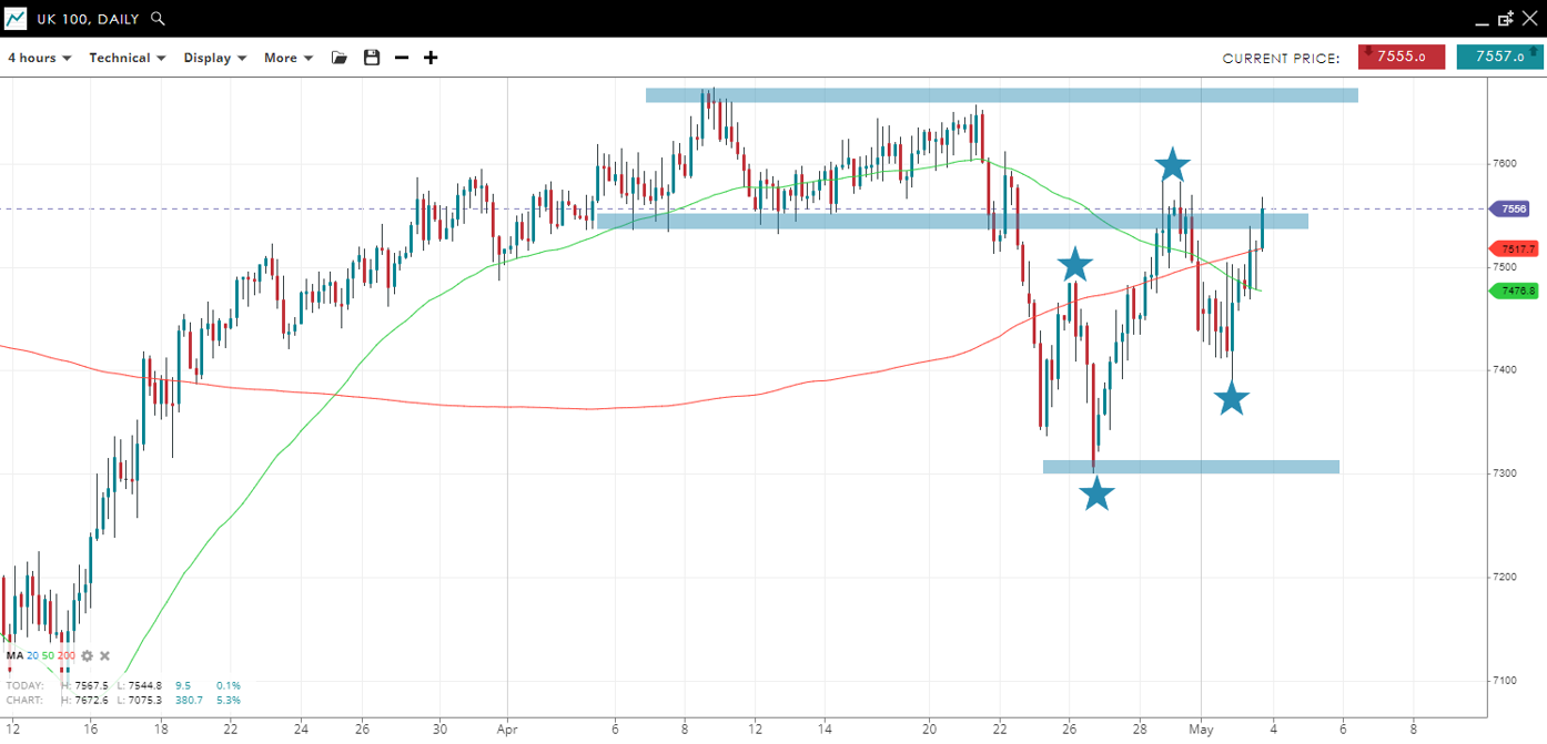Price has made a higher high and higher low, putting an end to the drawdown from the April 21 high. A break above 7550 would suggest a re-test of the prior high at 7670, while a failure would imply the move up off the lows was corrective and that another test of 7300 is likely.