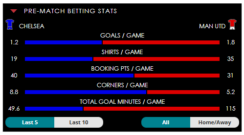 To see all the Chelsea v Man Utd betting stats and form, visit our pricing page to view our Pre-Match betting stats table or hover over/tap the chart image to see previous outcomes for that particular market.