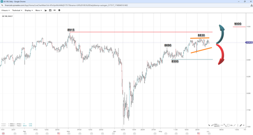 Technicals suggest that the FTSE 100 is about to complete a V-shaped recovery, trading near its record high of 8915 at 8830. If the short-term consolidation ends (suggesting an ascending triangle) and Footsie moves past the peak, it would initially open the door to the 9000 handle. However, if prices drop below the short-term support level of 8690, bears may take control, pushing the index towards 8500 and potentially shifting the overall sentiment.