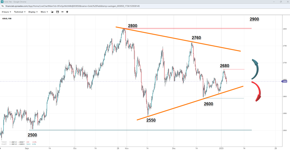 Gold appears to be forming a symmetrical triangle pattern since October's peak of $2800, with prices consolidating between a descending trendline to $2550 and an ascending resistance around $2760. The pattern suggests falling volatility as prices approach the apex, with the recent rejection at $2600 acting as a potential bottom. A move above the $2680 resistance might trigger bullish price action toward $2900, while a break below $2550 could see further downside towards $2500.