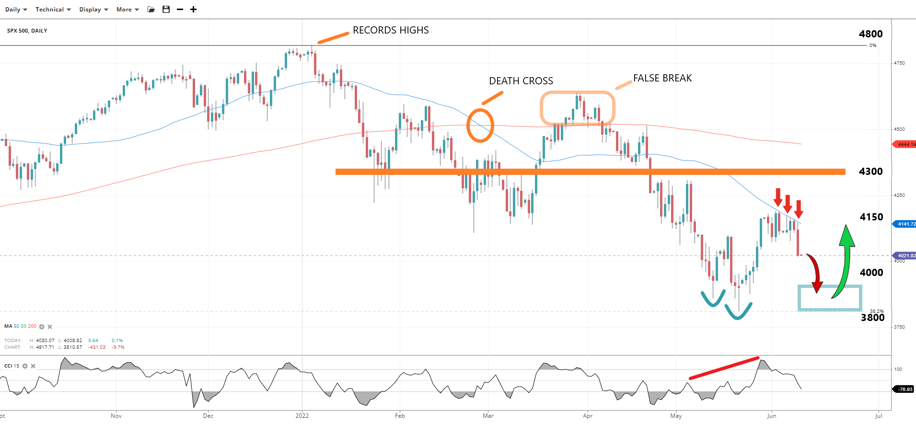 Technicals are a little clearer. The SPX has been in a bear market since the ‘death cross’ in February. The early March breakout above the 200-day average proved to be fake and from there it’s been a downward spiral below the 50-day, suggesting downtrend acceleration. We saw a recent rally up above the 4k handle, but the SMA at 4150 repelled bulls. Now, we look bearish again, but will it last?