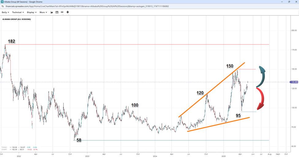 With the potential completion of a broadening ascending wedge pattern at $95, the door has opened for Alibaba's stock to potentially reach the 2025 peak of $150 and extend to a 2021 high of $182. However, if the bulls fail to reclaim the nearby peak, prices might revert to the $120 support and even break lower to the $100 handle. At that level, the pattern's failure might determine whether the correction phase is over and the bottom is in at $58, or if an attempt under the lower ascending trendline brings the bottom into focus.