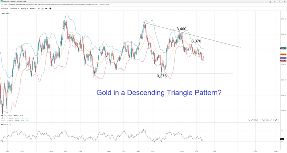 Gold prices are lower than they were at the start of the week as traders balance out positive news on the geopolitical front against the risk of a hawkish commentary from Fed officials towards the end of the week. RSI is still above 30, suggesting there could be more room for a downward move, as a potential triangle pattern could be incomplete. The yellow metal could find support at the round $3300 handle before heading to the latest swing low at $3275. A turn to the upside could find resistance at $3370, a minor top formed just ahead of the start of Ukraine peace talks. The next resistance level is at the August high at $3400.