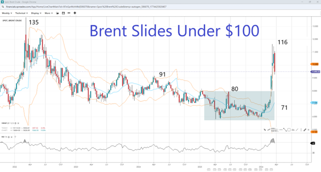 • Brent hovers around $100 per barrel as markets price in hopes of a diplomatic solution to the war.
