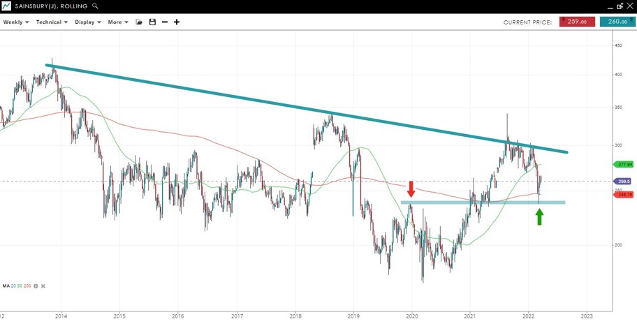 Bigger picture, SBRY is still underneath a 10-year old downtrend line - meaning the long term trend is down. The shares have been pulling back from the rally off the 2020 low after a failed break of this long term downtrend line. The pullback has found support at old resistance from the late 2019 peak. If this level holds, there is scope for another test of the downtrend line and a possible long term breakout into a new uptrend.