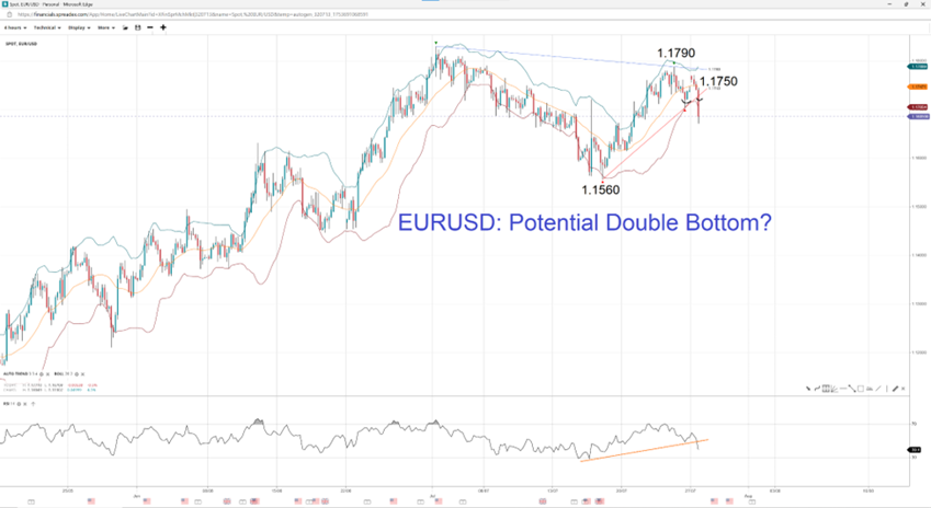 The EURUSD (EUR/USD) fell almost 100 pips in early trading on Monday after the deal was announced. The sharp move formed a double bottom for now following a false break, but a continuation of the move could find lower support at last week's low of 1.1620. A break below that level could encounter support at the swing low of 1.1560. However, if the double bottom holds, the next resistance lies in the middle Bollinger Band at 1.1750, with the next level being the near-term swing high of 1.1790.