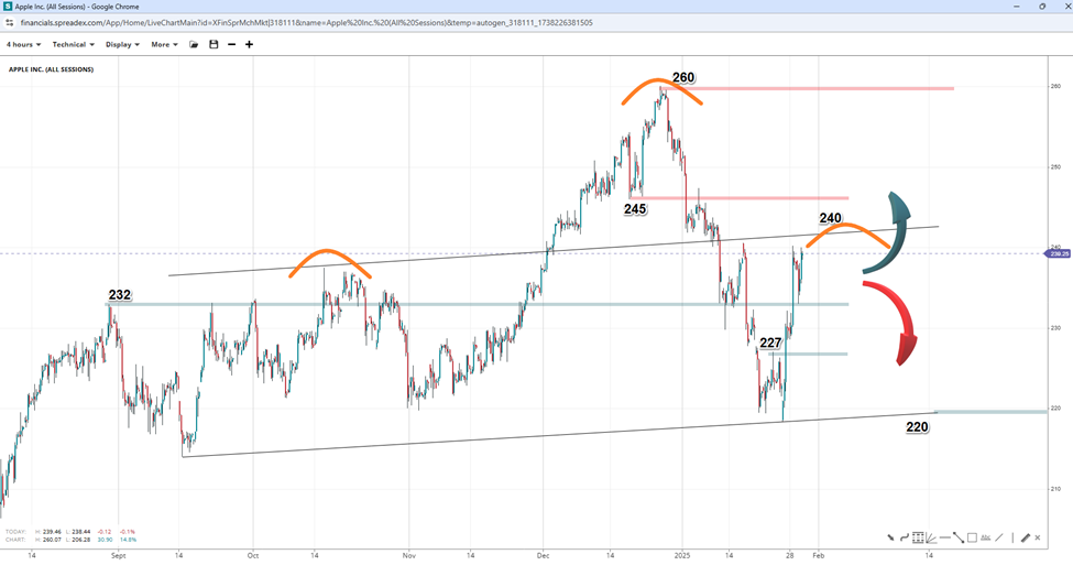 Apple's pattern suggests an ongoing head-and-shoulders (H&S) pattern, which could signal potential downside risks once it reaches the right shoulder at a price of nearly $240 per share. The reversal pattern that peaked at $260 hints at more profound implications, as failure to move higher could break the $232 and $225 short-term supports and extend to the neckline near $220, followed by lower declines. On the flip side, breaking past the upper neckline might trigger further continuation above $245 and the record peak, suggesting a double-bottom formation instead.