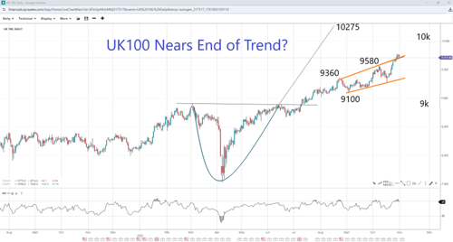 The UK’s premier index is coming off record highs at the end of October after rising above the upper trendline of what seems to be an open wedge pattern. If the chart pattern is completed, prices could start correcting towards 9360 if 9580 gives way to bears, ultimately exposing 9100 and the 9k handle. However, if bulls can sustain support, FTSE could accelerate towards the 10k handle, opening the door to the V-shaped recovery measured move target of 10275.