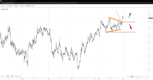 The US Tech index might have concluded a diagonal pattern above the 13225 mark, preparing for a decline towards 12690. The index is now pushing above its sideways range, with buyers needing to break past this local top to drive the rally to 13720 before reversing. A fall below 13k could indicate that the index may start to correct.