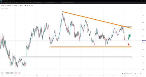 The EUR/GBP pair is about to potentially complete a larger triangle pattern anywhere between current levels and the low of 0.8718. Falling under the support level would invalidate the pattern and may open the door to 0.8650. A bullish reversal may offer an upward leg toward 0.8875 if bulls can gain control of the 0.88 handle.