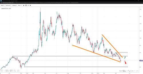 The London gas market saw yet another price decline last week, falling under $700 but may have ended a diagonal at 675. Bulls may seek to reclaim 755; if done so successfully, we could see a revisit of the 800 barrier. Any setbacks may trigger further downward pressure, potentially clearing the path toward the 600 threshold.