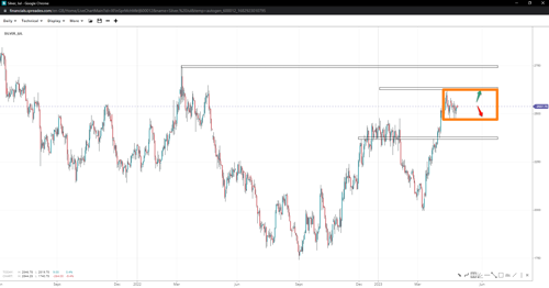 Wall Street is exhibiting an overall positive price action and is at the top of its consolidation range after ending a flag pattern. Investors should be cautious near 34500 and 34930 to uphold against pullbacks. Further drops may result in a retreat to 33600, while a successful break lower could target the 33190 mark.