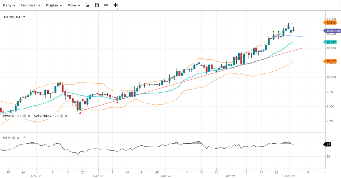 UK 100 remains in a strong bullish trend but has entered a pullback phase. While it maintains its position above the VWAP, momentum is reaching elevated levels, suggesting the index is testing the upper limits of its current impulsive move.