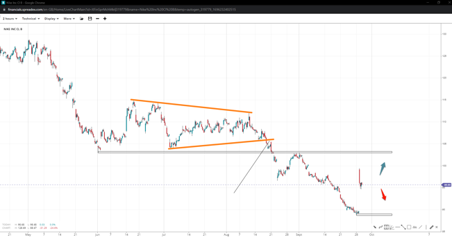The stock price of NIKE experienced an open gap recently after extending measured-move declines post-triangle pattern, jumping near triple digits but seeing a weak attempt initially there. If the short-term support of $95 holds firm, the stock could advance to $103, where bulls are expected to receive resistance. Sliding under the regional support for $88 would expose $85 next.
