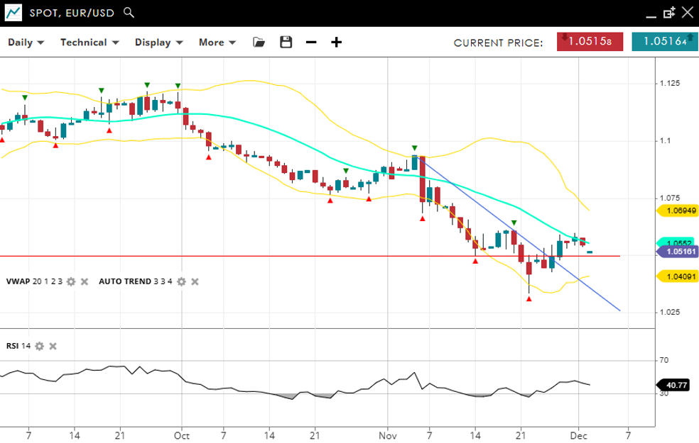 EUR/USD remains distinctly bearish but has adjusted into a correction phase, trading at 1.0516, just below the VWAP (20) of 1.0552. Support is at 1.0409, with resistance at 1.0694. The RSI at 40 signals less bearish momentum than last week.