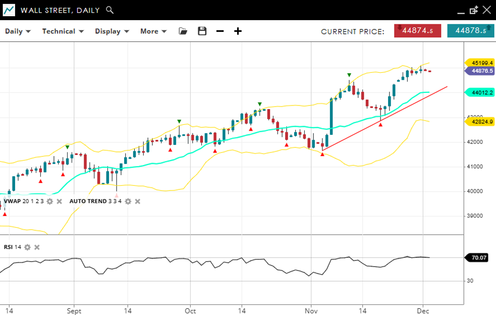 Wall Street remains bullish and is in an impulsive phase, trading at record highs of 44,876, comfortably above the VWAP (20) of 44,012. Support is at 42,824, while resistance is positioned at 45,199. The RSI at 70 signals strong bullish momentum in overbought territory in line with the prevailing bullish environment.