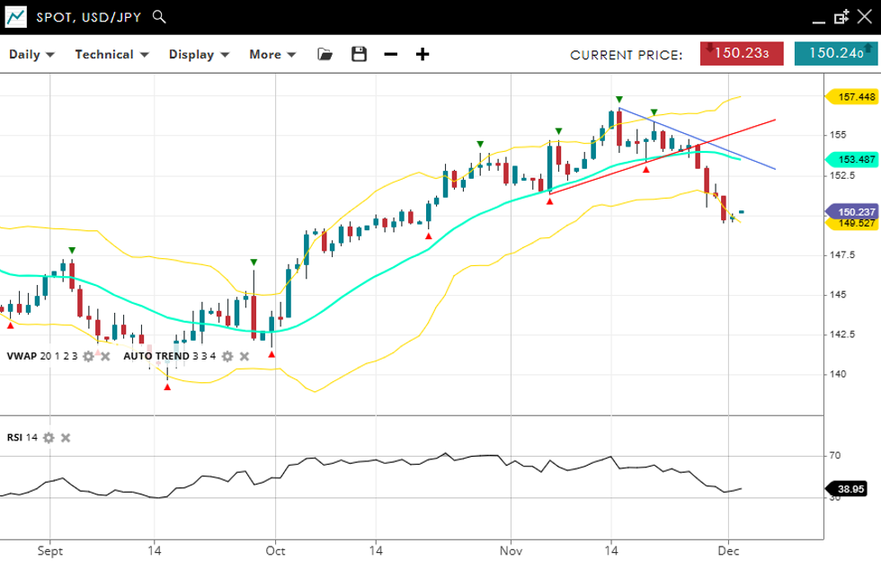 USD/JPY has seen a steep correction of its former bullish trend and looks to have topped for the time being, trading at 150.23, below the VWAP (20) of 153.48. Support is near current levels at 149.52, with resistance at 157.44. The RSI at 38 reflects new bearish momentum.
