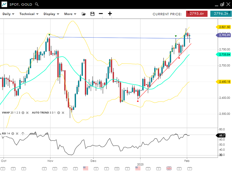 Gold is in a strong bullish impulsive phase hitting a new record high last week, trading at 2,795, comfortably above its VWAP (20) of 2,735. Support is identified at 2,650, while resistance is at 2,821. With an RSI of 68, gold has pulled back from overbought conditions, signaling the potential for near-term profit-taking before another leg higher.
