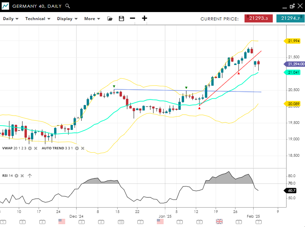 Germany 40 sustains its strong bullish momentum in an impulsive phase, currently trading at 21,294, well above its VWAP (20) of 21,041. Support is established at 20,089, while resistance is set at 21,994. With an RSI of 60, bullish sentiment remains intact, though price action suggests potential consolidation before further gains.