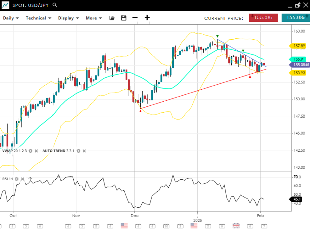 USD/JPY remains in a bullish corrective phase, trading at 155.08, slightly below its VWAP (20) of 155.91. Support is firm at 153.93, while resistance is positioned at 157.89. The RSI at 45 suggests bearish (but a push towards more bullish) sentiment, though price action via the break of the down trendline indicates a potential renewal of the uptrend.