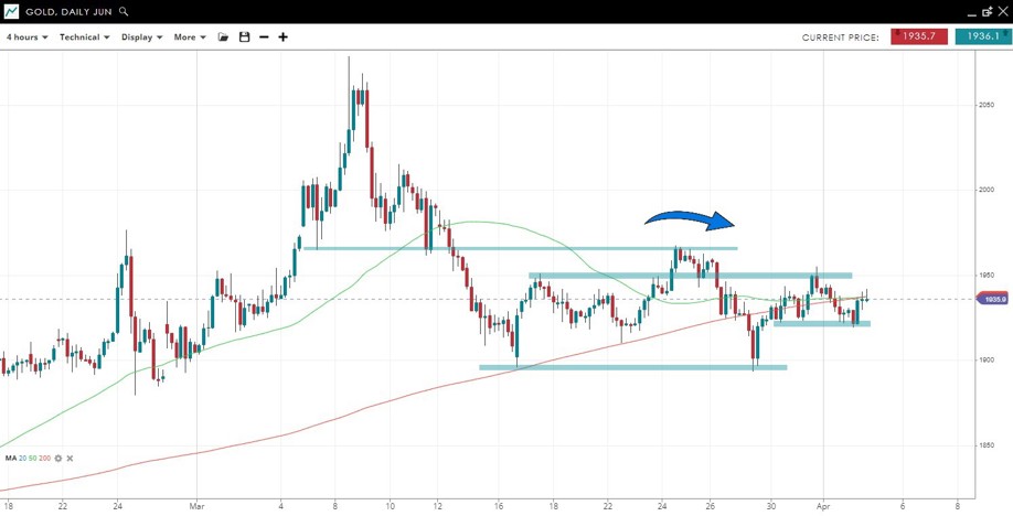 Gold slid under its 200 SMA but rebounded off the March 17 low, leaving it in a sideways range under 1950. Whether near term support at 1920 holds may determine which way the range breaks.