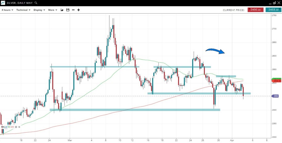 Silver is trading sideways but has rolled under its 200 SMA for a second time after failing to break the 50 SMA. A break over the 50 SMA & the near term resistance at 2530 is needed to reverse bearish momentum.