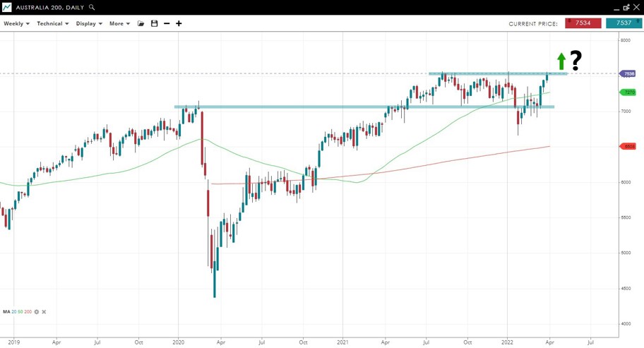 The Aus 200 index is testing all-time highs after a narrow pullback under its former high from 2020 at 7000. A breakout could open up a major new uptrend.