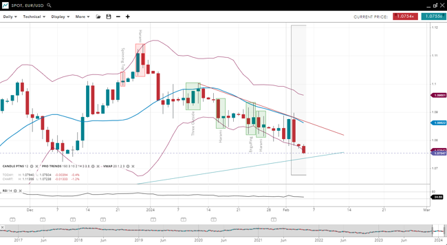 EUR/USD is experiencing the impulsive phase in a bearish trend, with the price below the 20-period VWAP of 1.0862. The support is at 1.0764, with resistance at 1.09601. The RSI at 34 indicates a strong bearish bias, suggesting potential for further declines.
